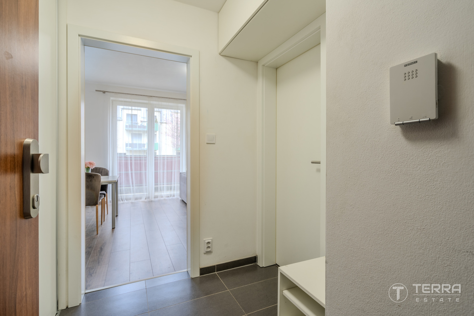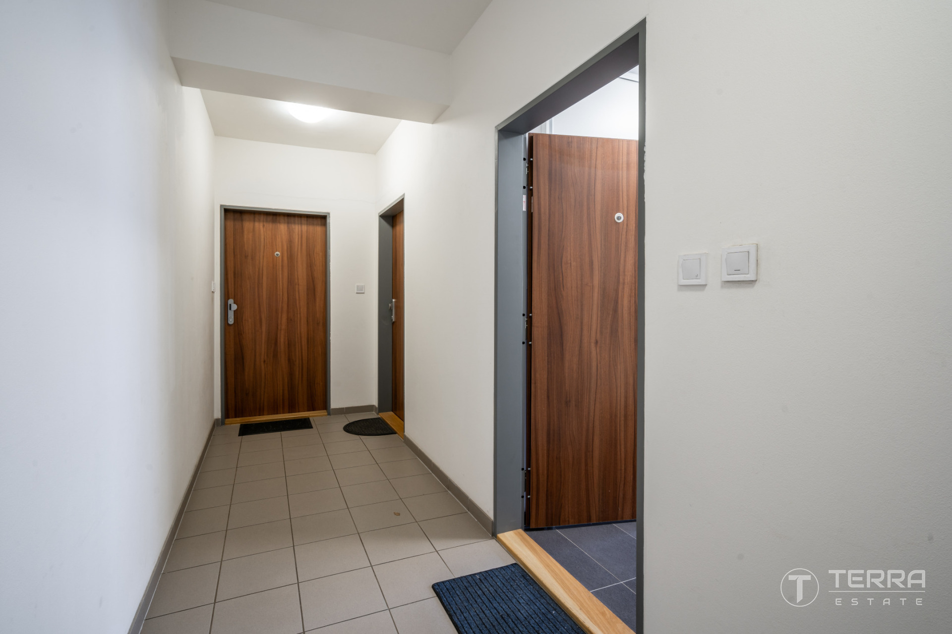 K bytu náleží příjemná terasa o velikosti 4 m² orientovaná do klidného vnitrobloku, dále sklep a venkovní parkovací stání, které zajišťuje pohodlné parkování. V chodbě jsou praktické vestavné skříně, které nabízí dostatek úložného prostoru. Okna jsou vybavena elektrickými venkovními žaluziemi, které zvyšují komfort bydlení i soukromí.