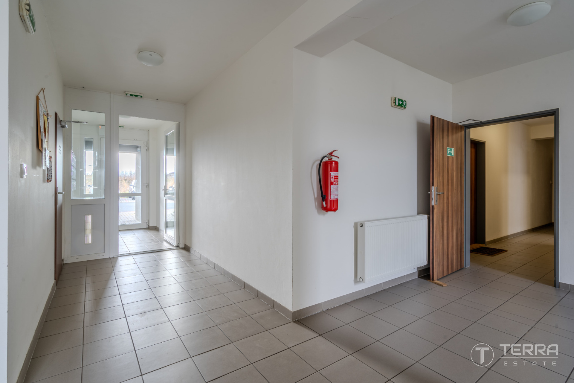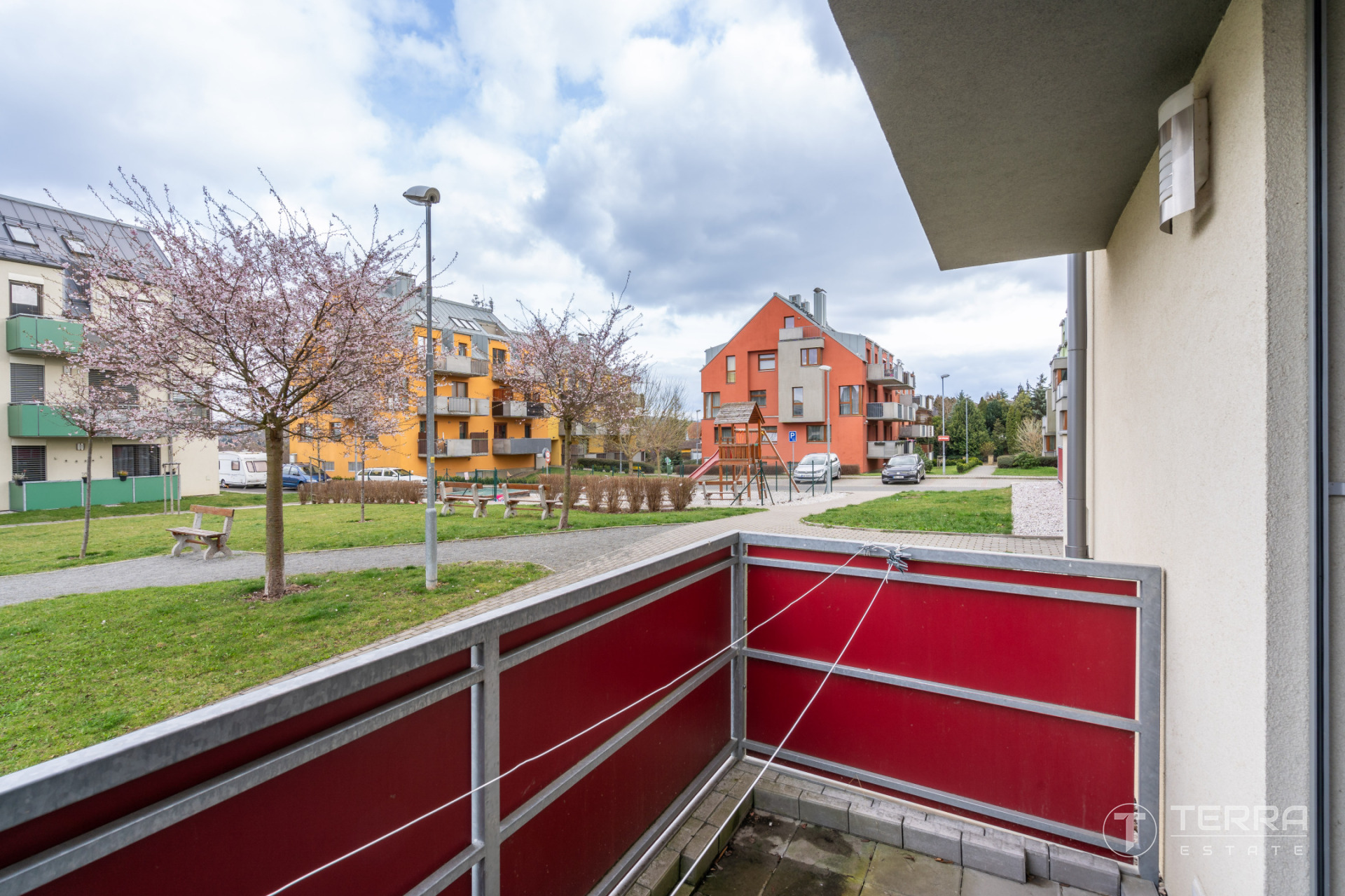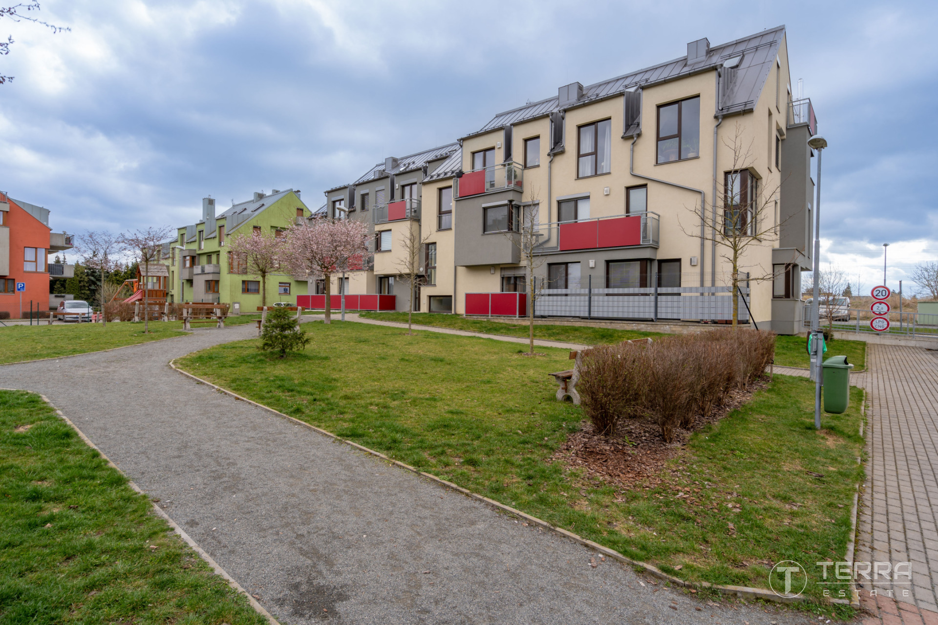 K bytu náleží příjemná terasa o velikosti 4 m² orientovaná do klidného vnitrobloku, dále sklep a venkovní parkovací stání, které zajišťuje pohodlné parkování. V chodbě jsou praktické vestavné skříně, které nabízí dostatek úložného prostoru. Okna jsou vybavena elektrickými venkovními žaluziemi, které zvyšují komfort bydlení i soukromí.