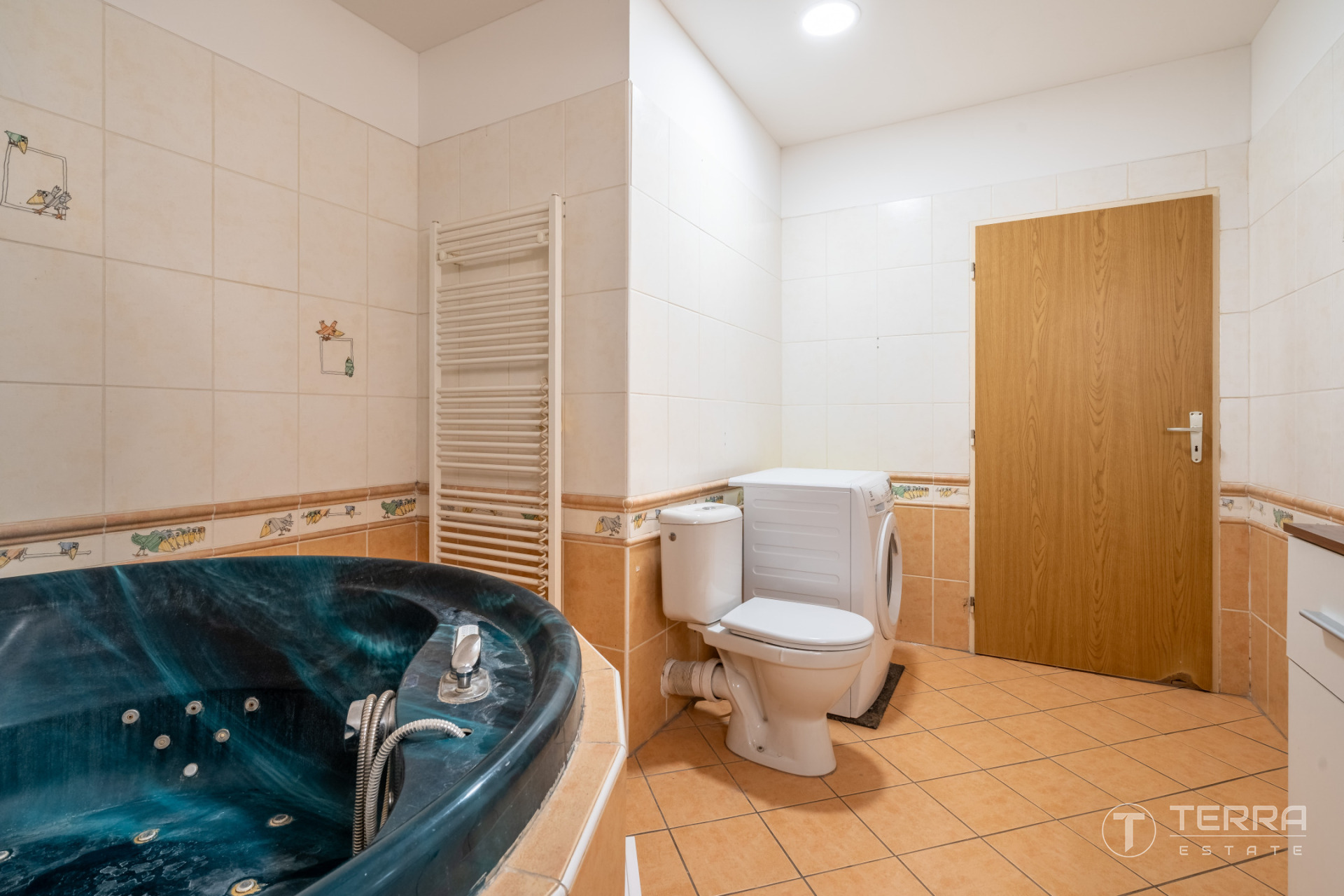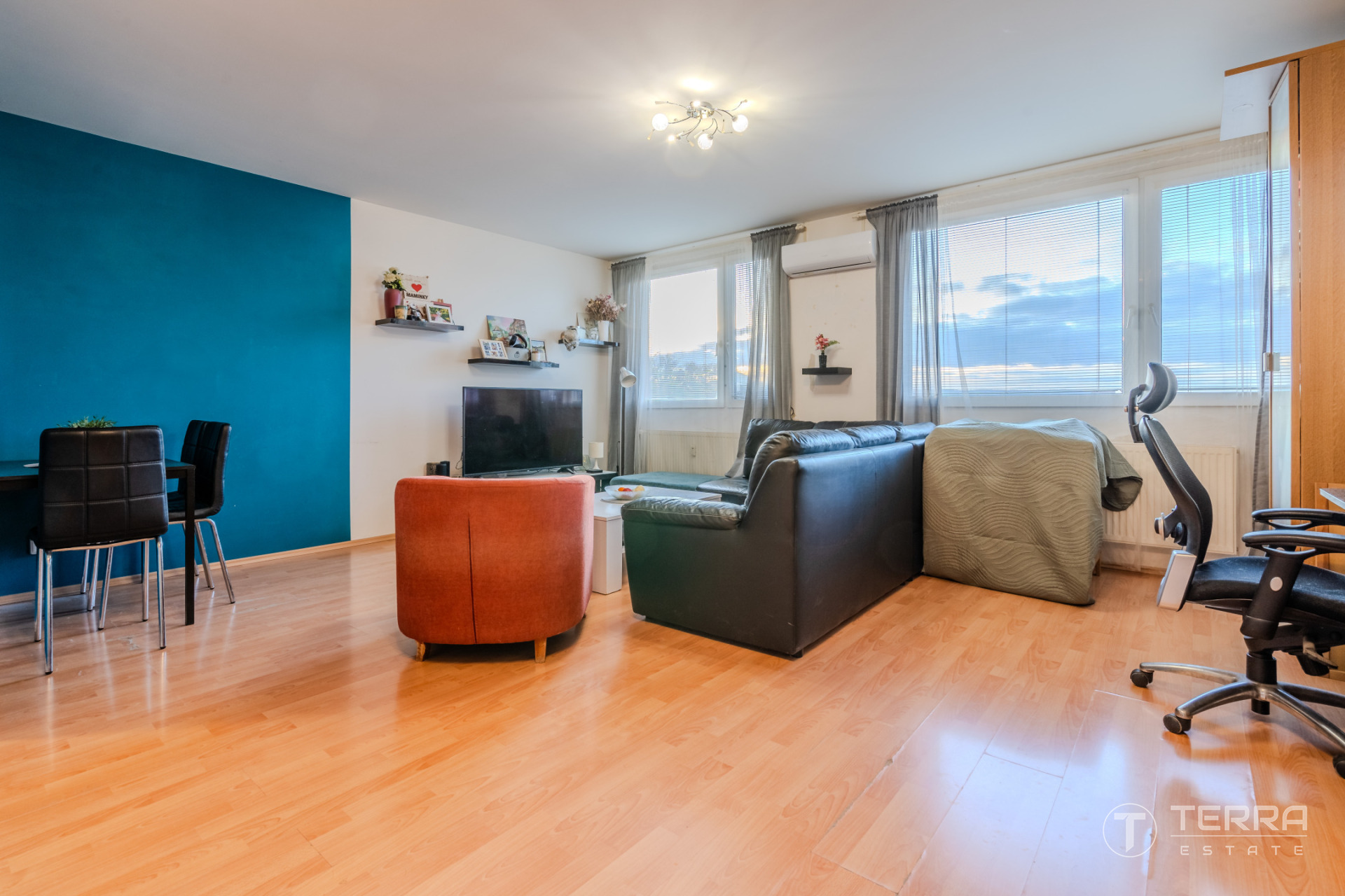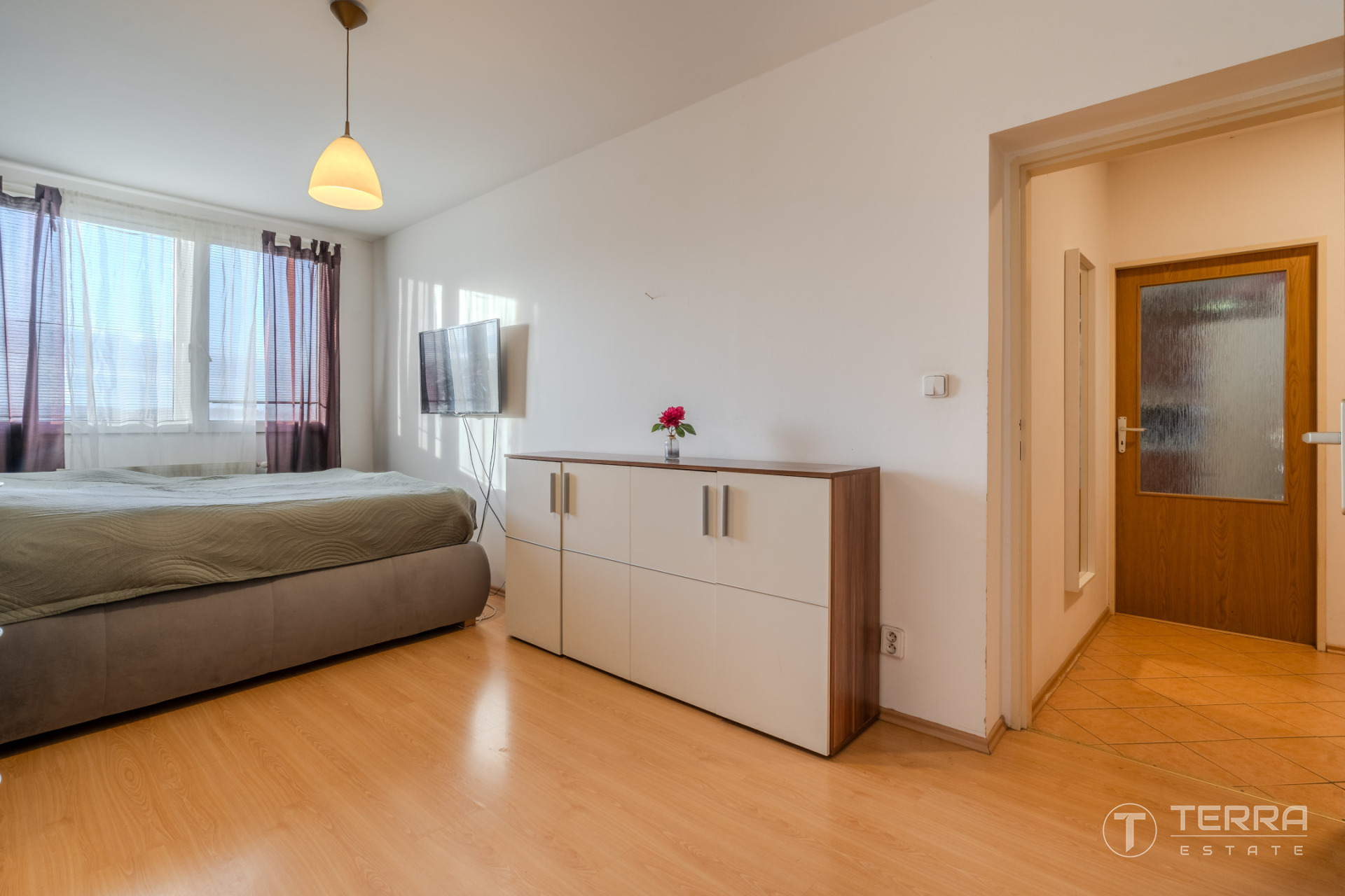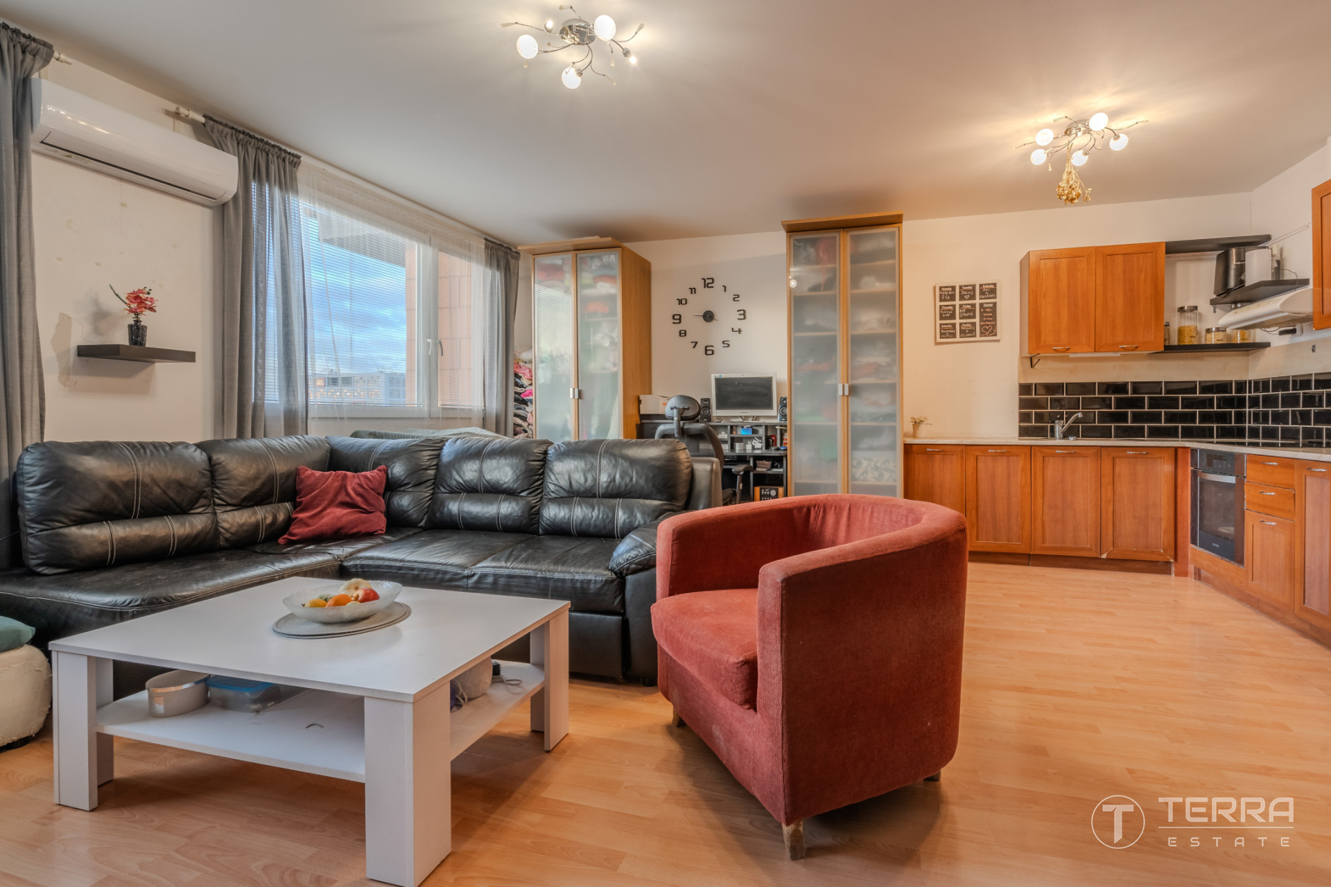 Byt je velmi prostorný – hlavní obytná část s kuchyňským koutem nabízí dostatek místa pro pohodlné bydlení, nechybí samostatná šatna ani prostorná koupelna. Velkým bonusem je zabudovaná klimatizace, která zpříjemní horké letní dny.